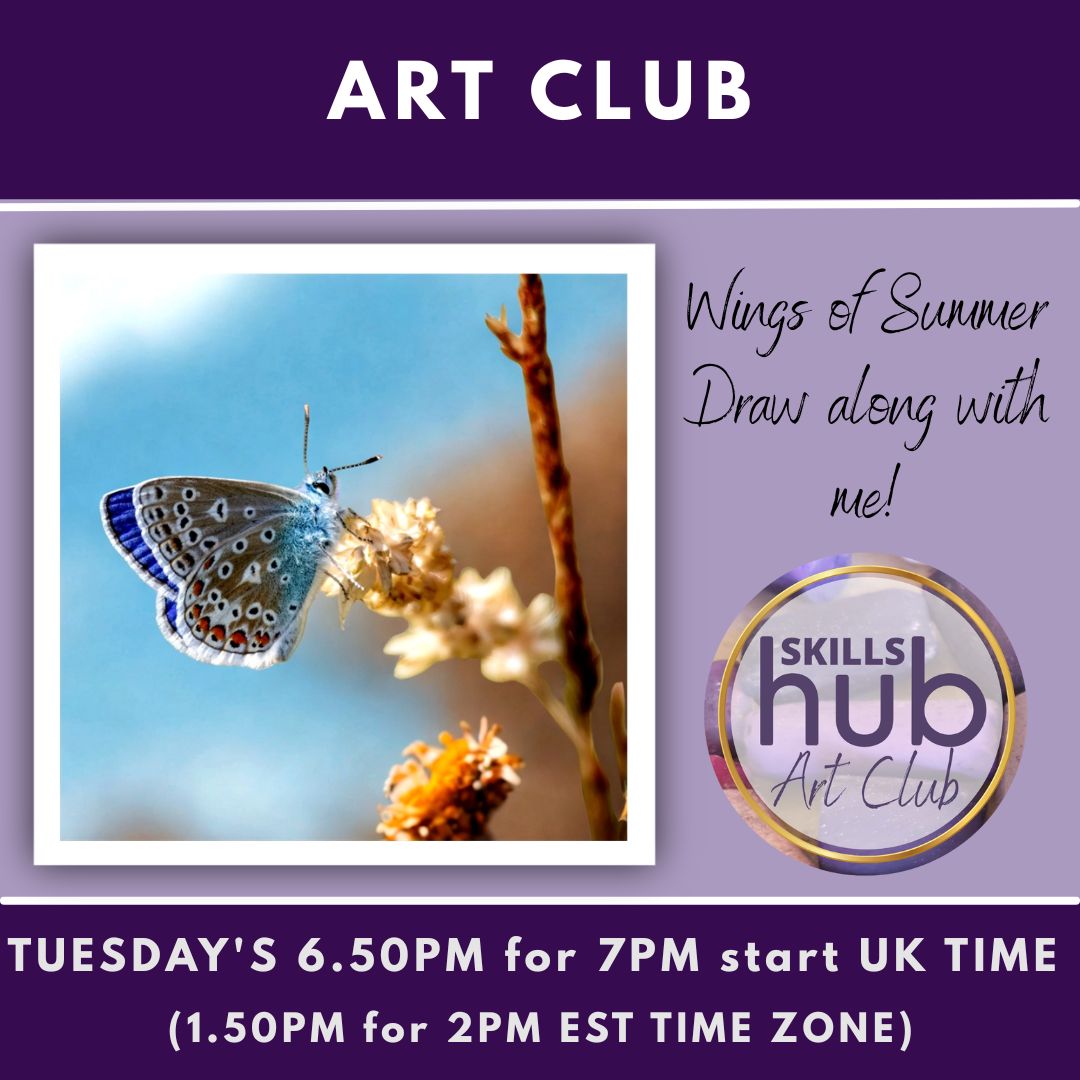 Draw and pastel along with Sue - the beautiful common blue butterfly. Tuesday evenings in July/August 6.50pm (BST) which is 1.50pm (EST)
